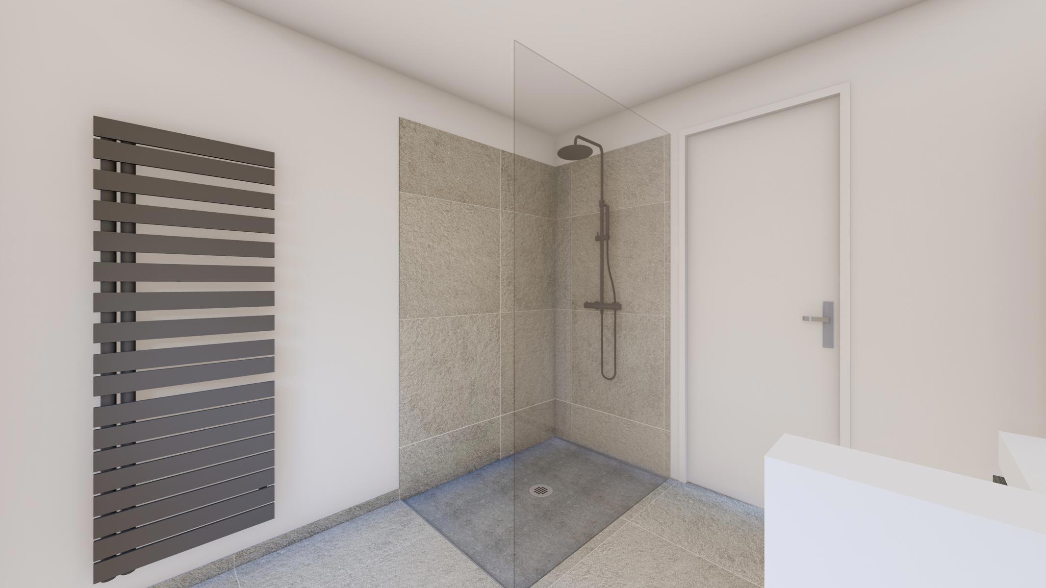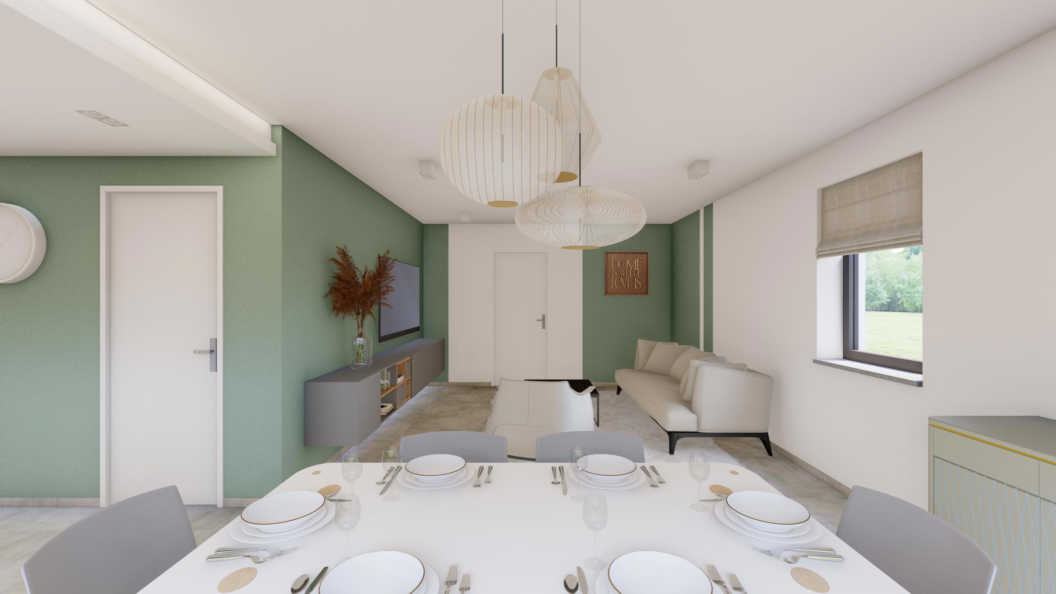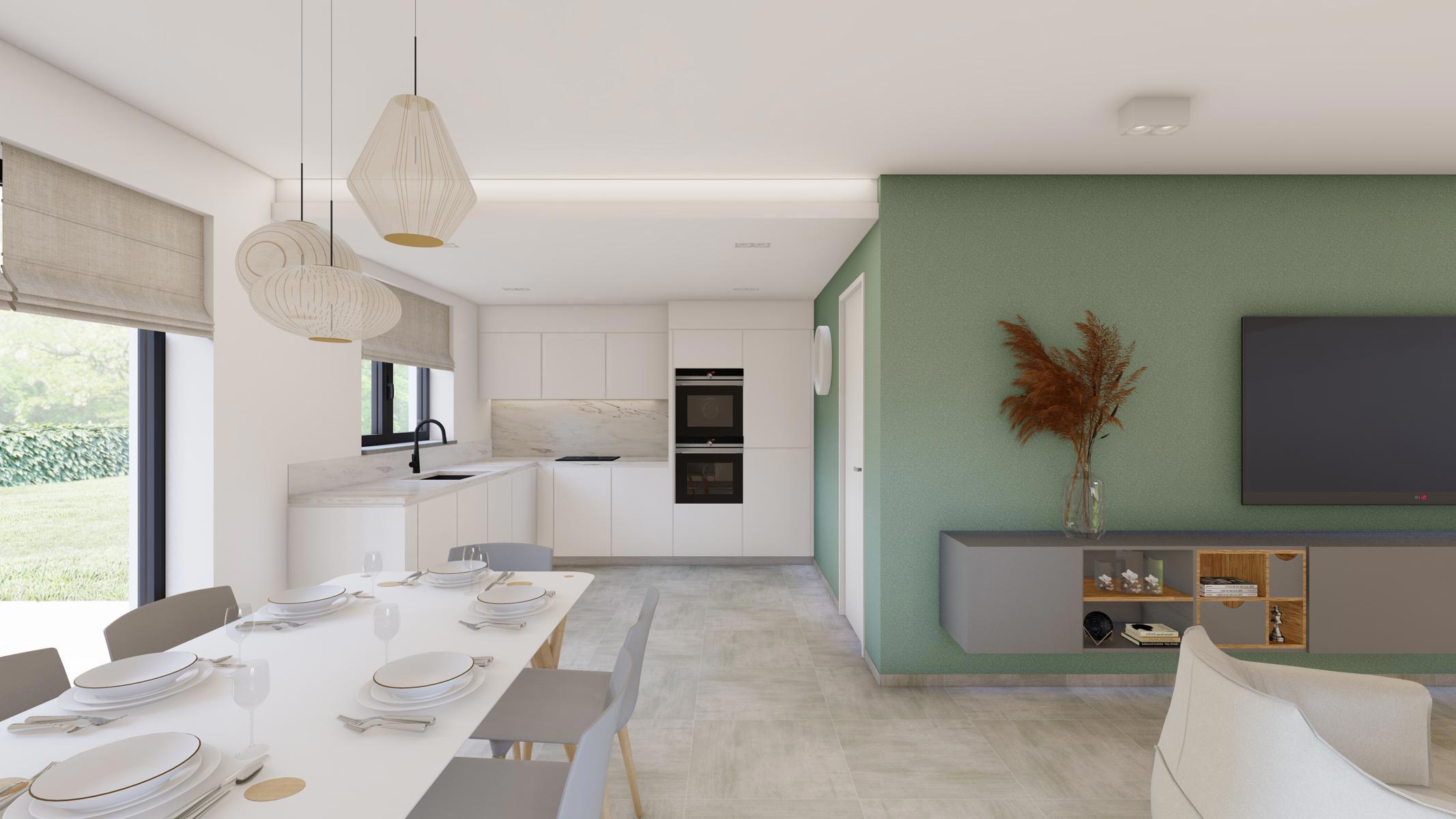 rez : hall d'entrée - WC - living avec accès vers la terrasse - cuisine ouverte - garage avec espace buanderie