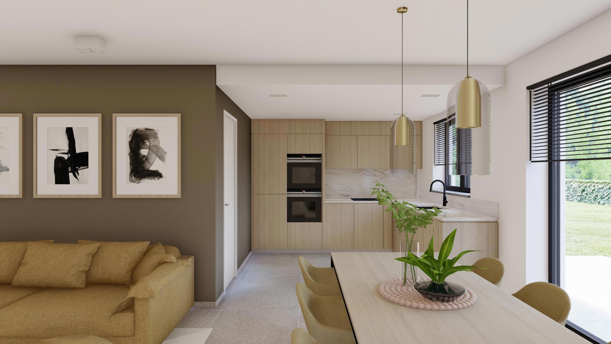 rez : hall d'entrée - WC - living avec accès vers la terrasse - cuisine ouverte - garage avec espace buanderie